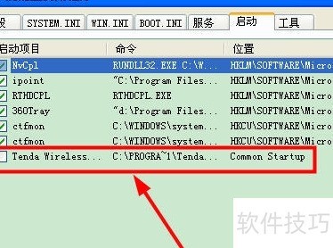 5、 打开开始菜单,选择运行,输入msconfig后确认,进入系统配置界面,切换到启动选项卡,取消勾选已安装的无线网卡驱动对应的启动项,最后保存设置即可完成操作。