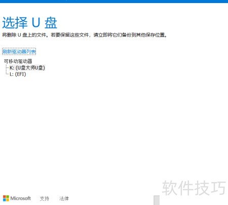11、 在Windows 10安装程序的选择可启动设备界面中,确认选中U盘作为安装介质,然后点击下一步继续操作。