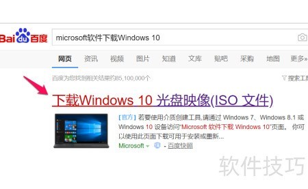 2、 在百度搜索栏输入Microsoft 软件下载 Windows 10即可查找相关资源。