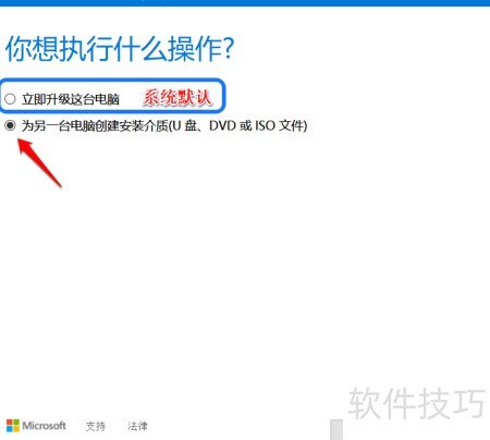 8、 在Windows 10安装程序的你想执行什么操作?界面中,默认选项为立即升级这台电脑。若当前需要升级系统,直接点击下一步即可继续。如果暂不升级本机,可选择为另一台电脑创建安装介质,支持U盘、DVD或ISO文件格式。本次操作选择后者,用于制作安装盘。插入U盘后,勾选该选项并点击下一步,进入后续设置步骤,准备创建系统安装介质。