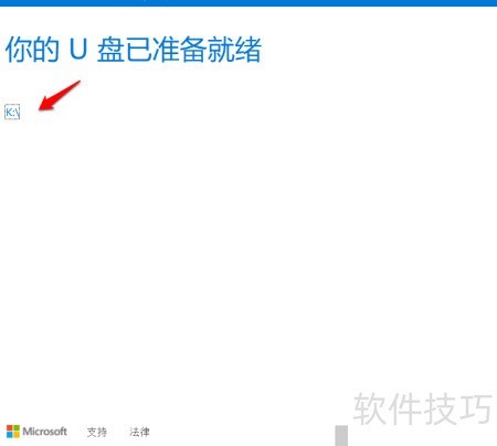 16、 Windows 10安装程序提示U盘已准备就绪,磁盘符为K:,点击完成即可结束操作。