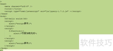 5、 JavaScript代码按照自上而下的顺序执行,首先会弹出script脚本1的提示框,接着弹出script脚本2的提示框,最后当页面完全加载后,触发\$(function(){})中的内容,弹出页面加载完成的提示信息。整个过程严格遵循代码的书写顺序和页面加载流程。