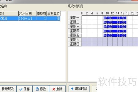 10、 这是班次管理页面开启后的界面,在此可设置工作班次。请根据企业实际情况进行配置,通常公司设一个常规班次,如上午九点至下午六点,中午休息一小时;部分企业则分为白班与晚班两种安排。