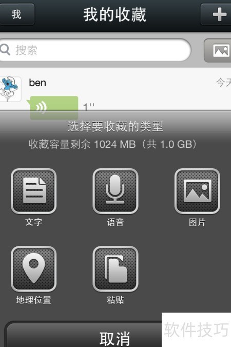 4、 收藏功能默认提供1024M存储空间,支持保存文字、语音、图片及地理位置等内容,具体所示。