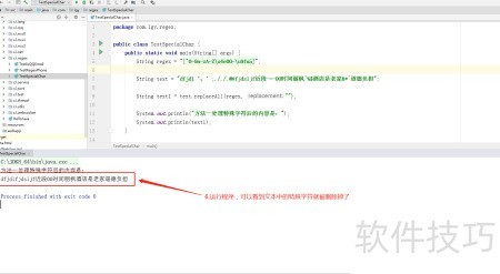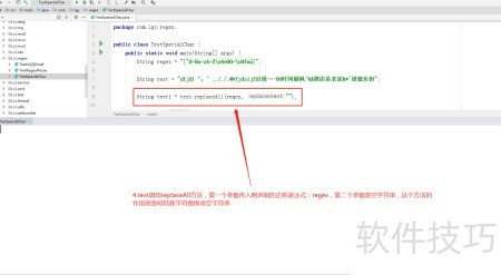 4、 调用text的replaceAll方法,传入先前定义的正则表达式regex作为第一个参数,第二个参数为空字符串,作用是将所有匹配的特殊字符替换为空字符串,从而实现字符清理。