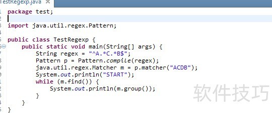 4、 创建一个Java程序,用于测试正则表达式的匹配功能。首先定义一个名为test的包,并在其中声明一个类TestRegexp。该类包含主方法作为程序入口。在主方法中,设定一个正则表达式模式:以字母A开头,中间可包含任意数量的任意字符,随后出现字母C,再经过若干字符后以字母B结尾,整个字符串需完全符合此结构。该正则表达式被表示为^A.*C.*B\$。利用Pattern类的compile方法将此字符串编译为一个正则表达式模式对象p。接着,针对目标字符串ACDB,使用该模式创建一个Matcher对象m,用于执行具体的匹配操作。程序运行时首先输出START,然后通过while循环调用find方法查找所有符合条件的子序列。每当发现匹配内容,便通过group方法获取匹配结果并打印到控制台。该代码主要用于验证给定字符串是否满足预设的正则规则,并输出匹配成功的部分。尽管示例字符串ACDB看似可能符合逻辑描述,但实际运行结果取决于正则引擎对模式的解析与匹配过程。