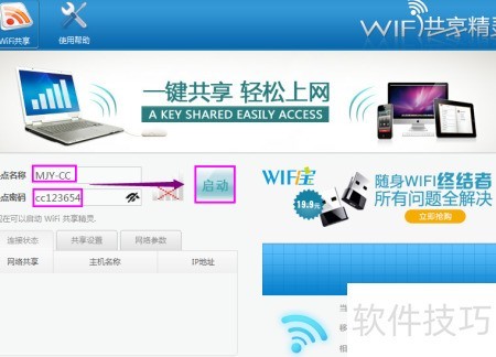 3、 打开WiFi共享精灵,设定热点名称与密码,点击启动。等待片刻,系统自动进入启动界面,直至无线网络成功开启并可使用。