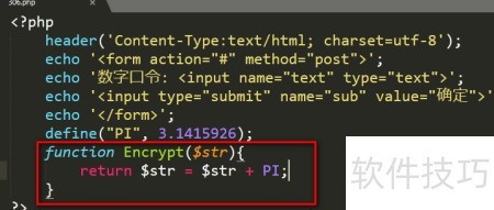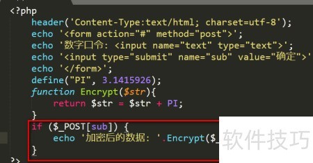 7、 调用自定义的 Encrypt() 函数,通过 echo 语句显示加密结果,具体代码见下图所示。