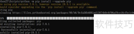5、 若安装过程中提示pip需升级,可进入Python27安装目录下的Scripts文件夹,执行命令python -m pip install --upgrade pip完成更新。
