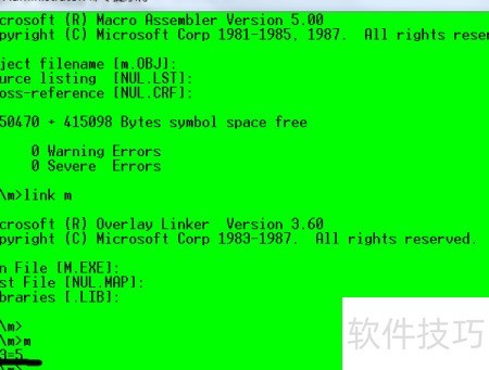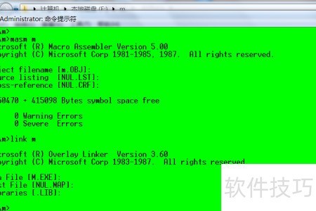 13、 第八步,将文件m.txt改名为m.asm,随后在命令行中依次执行汇编、链接操作,最后运行生成的程序。