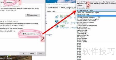 3、 在弹出窗口中切换至管理选项卡,点击底部的更改系统区域设置按钮。随后,将非Unicode程序语言修改为中文(简体),具体操作所示。
