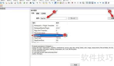 11、 进入插件管理界面,切换至可用选项卡,在搜索框内键入NppCalc,勾选结果中的插件名称,随后点击安装按钮即可完成插件的安装操作。