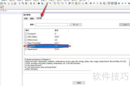 4、 进入插件管理界面,切换至可用选项卡,在搜索框内键入NppCalc,勾选结果中的插件名称,随后点击安装按钮完成插件的安装操作。