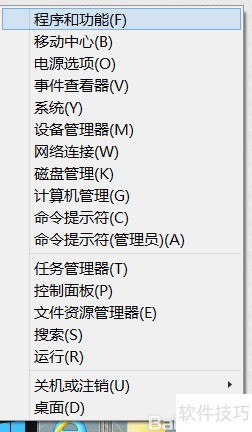 3、 按下Win+X键,选择程序和功能即可找到相关选项。