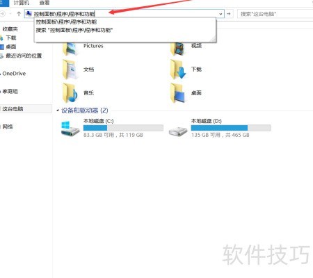 5、 方法三:打开资源管理器,输入或粘贴控制面板程序和功能即可访问。