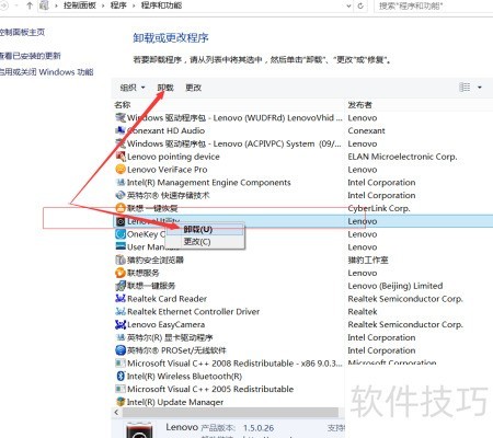 7、 可点击上方箭头所指的卸载按钮,或在程序名称上右键单击,从弹出的菜单中选择卸载即可完成操作。