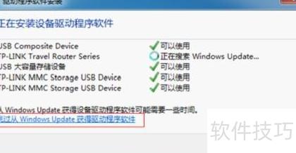 19、 系统默认从Windows Update搜索驱动程序,选择跳过从Windows Update获取驱动程序软件后稍等片刻,界面将显示后续提示信息。
