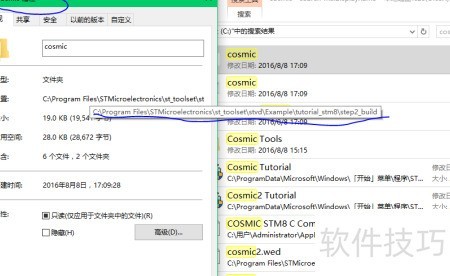 6、 找到目标文件夹后,通过查看其属性即可明确具体路径,如步骤5所示,逐步深入查找,尽管层级较深,但仍能顺利定位。选中Cosmic文件夹后进入下一界面,选择所用芯片型号,点击图中红线标注的1,再点击2,此时OK选项即可启用,基础工程已成功建立。