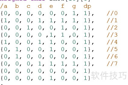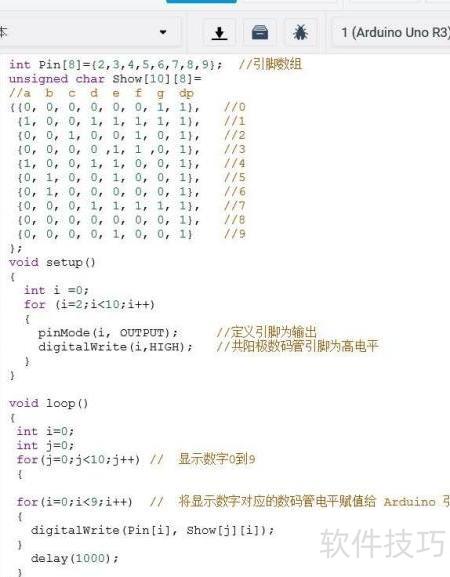 5、 将数码管的a至dp引脚所对应的Arduino引脚编号存入数组,利用for循环遍历数组,根据要显示的数字,依次设置各引脚的高低电平状态。