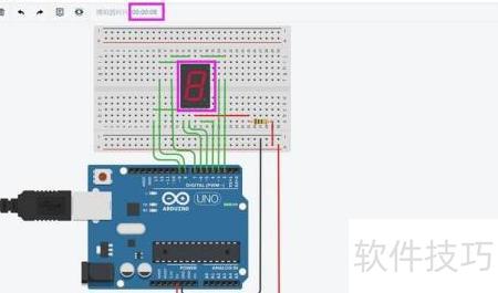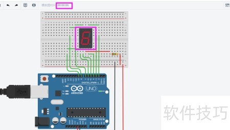 3、 将面包板、电阻和Arduino放置到工作区。由于使用的是共阳极数码管,需将数码管的公共端连接至+5V电源。接着,将Arduino的2至9号引脚分别与数码管的a、b、c、d、e、f、g及dp引脚相连,完成电路连接。
