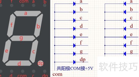 1、 数码管常见类型包括七段与八段两种。七段数码管由七个LED组成,通过控制不同LED的亮灭来显示数字,例如显示数字1时,仅b和c两段点亮,其余熄灭。根据电路连接方式的不同,可分为共阳极和共阴极两类。共阳极数码管的公共端COM接电源正极,当各段引脚输入低电平时对应段点亮;共阴极则将COM端接地,高电平信号使相应段发光。八段数码管在七段基础上增加了一个小数点位dp,用于显示小数。