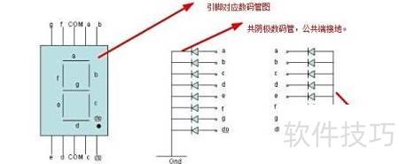 3、 引脚布局显示,外部八个引脚分别连接八个LED灯,另有两个为公共端。共阴极数码管的公共端需接地,而共阳极数码管的公共端则应接高电平,以确保正常工作。