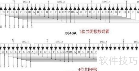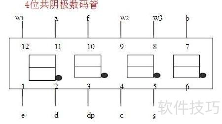 7、 通过对比外部形状可以发现,图中共阴极与共阳极数码管的1至12号外引脚,分别对应内部的e、d、dp、c、g、w4、b、w3、w2、f、a、w1引脚,排列顺序一致。