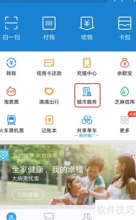 2、 登录后,首页展示多项功能,如钱包、各类服务及儿童失踪信息。在页面中部的其他服务区域,点击城市服务即可进入相应功能模块。