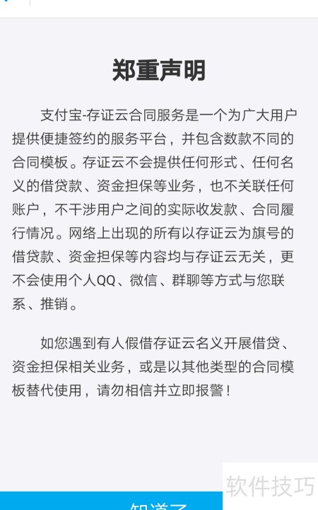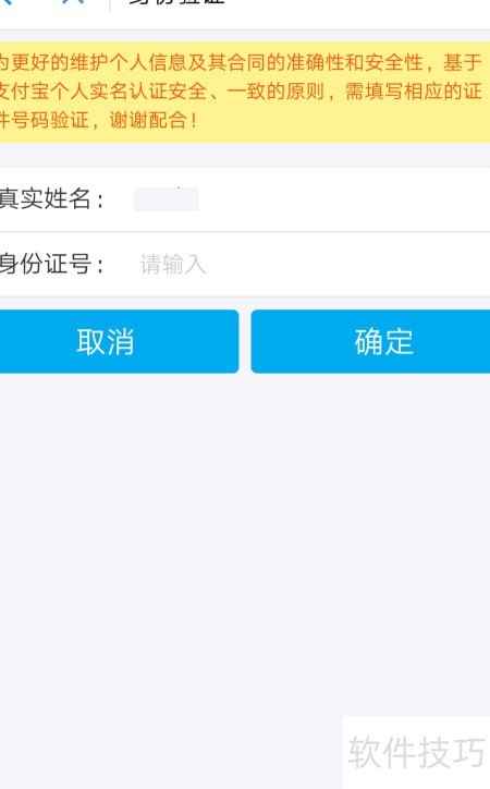 6、 首次使用该服务时,无论选择何种合同类型,系统均会弹出身份验证页面,需输入与支付宝账户持有人一致的身份证号码。完成输入后点击确定,即可通过验证,随后将跳转至温馨提示页面,展示相关法律法规的说明与提示内容。