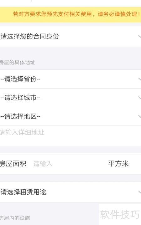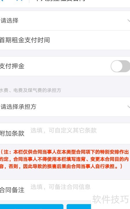 7、 点击温馨提示页面底部的开始按钮后,系统将弹出所选合同模板(如个人房屋租赁合同)。根据提示逐项填写内容,滑动屏幕可继续填写其他条款。页面下方提供相应操作按钮,支持保存为草稿或进入下一步操作。