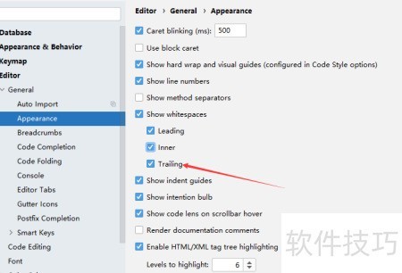 如何在DataGrip中关闭尾随空格的显示?使用过程中若需隐藏尾随空格,可通过设置调整,具体操作方法如下。