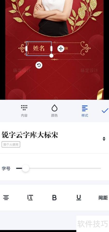 6、 在花边框左侧用金色粗体填写姓名,右侧用金色常规字体标注职位。