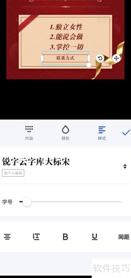 7、 在背景中下部用矩形工具绘制图片框,填充黄粉色,左上角以红色斜线装饰。框内插入文字区域,写入个人口号,底部添加联系方式,并用红色边框突出显示,整体布局简洁清晰,突出重点信息,最终完成女性经理手机名片的视觉设计。