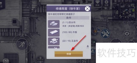 3、 应铁牛所托收集修房材料,集齐后点击修理图标完成修缮。