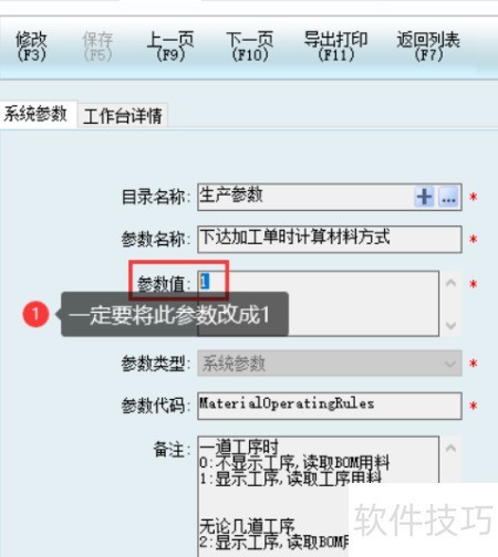 7、 进入系统维护的系统参数,将下达加工单时计块泉算材料方式设置为1。