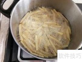 5、 手靠近油锅感到滚烫时,放入一根土豆条,见其迅速冒泡炸起后,便可陆续下入其余。