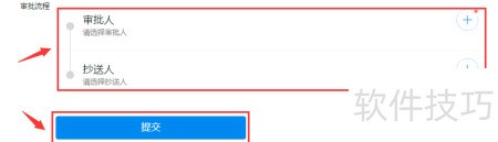 4、 选择好审批人和抄送人,点击底部提交按钮完成操作。