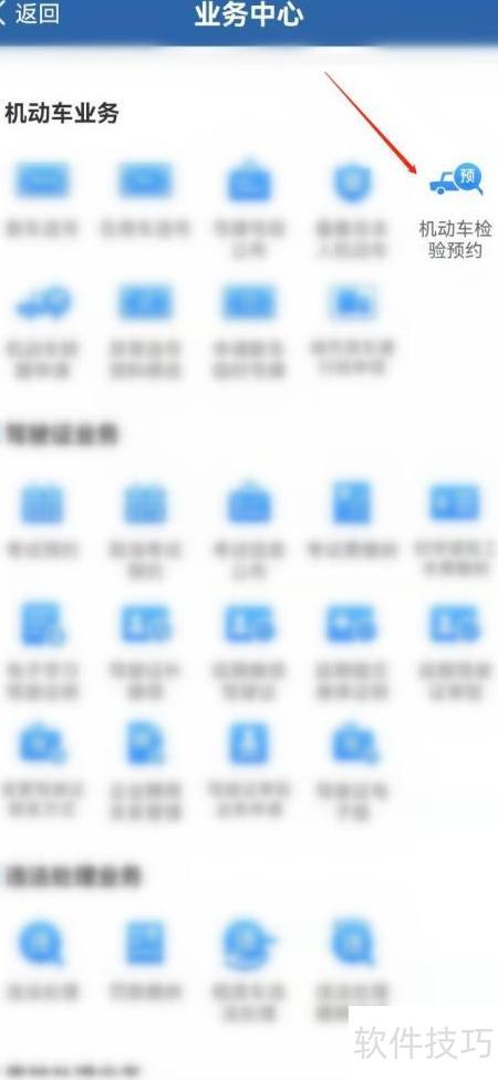 1、 登录交管12123,进入业务中心,选择机动车检验预约功能进行操作。