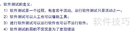 1、 软件测试是一种旨在保障质量的过程,可通过人工或工具实施。它既可在程序运行时进行,也可在不执行代码的情况下开展。测试不仅用于发现缺陷,还包括验证功能、提升可靠性等多种手段,以确保软件产品符合预期要求和用户需求。