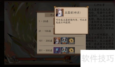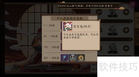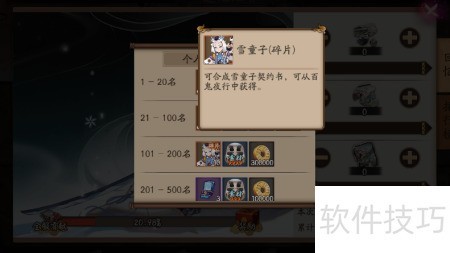 2、 奖励包含玉藻前契约书、雪童子与百目鬼角色、五星奉为达摩一枚、御行达摩契约书及五十万金币。