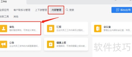 2、 进入工作台,依次选择内部管理与审批功能。