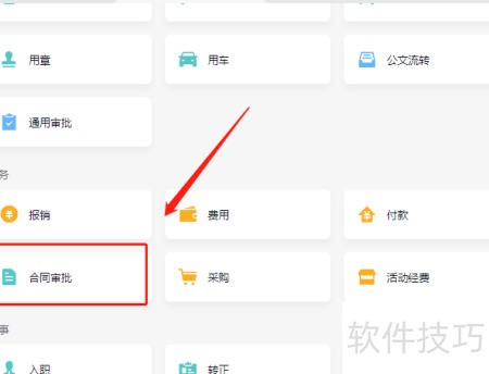 3、 在审批页面的财务栏目下,点击合同审批图标提交申请。