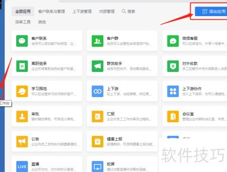 1、 点击左侧工作台菜单中的添加应用图标。