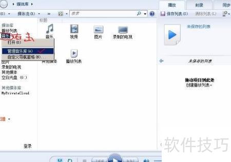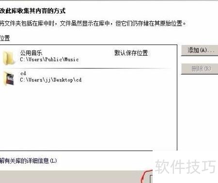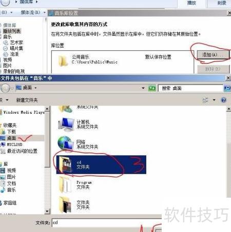 4、 在媒体库界面左侧列表中找到音乐选项,右键点击并选择管理音乐库。进入音乐库位置页面后,点击添加按钮,系统将打开资源管理器。在资源管理器中定位到桌面上的cd文件夹,单击选中该文件夹,随后点击包括文件夹即可完成添加操作。