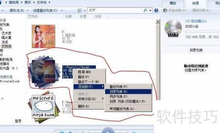 10、 右键点击媒体库中的CD文件夹,选择添加到刻录列表,其中所有歌曲将自动加入刻录队列。