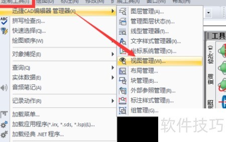 3、 在软件顶部菜单栏选择定制工具,从下拉列表中点击CAD编辑器管理器,接着进入视图管理选项。