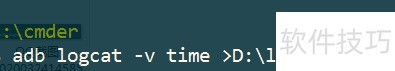 4、 输入命令 adb logcat –v time > D:loglog.txt,将带时间戳和级别为 error 的日志信息输出并保存至 D 盘 log 文件夹中的 log.txt 文件。