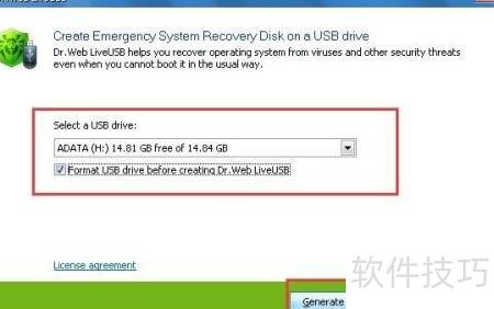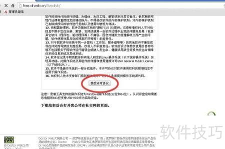 7、 可选择将Dr.Web LiveDisk免费下载并刻录至CD/DVD,或写入USB存储设备。在进行操作前,需先同意Dr.Web LiveDisk的软件许可使用协议。用户可根据自身需求选择合适的存储介质完成下载与制作,确保设备兼容并正确读取启动盘内容。