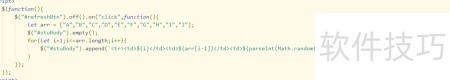 5、 在 jQuery 初始化函数内绑定按钮点击事件,声明数组 arr,通过 for 循环遍历数组,将包含数据的 HTML 代码动态插入到表格的 tbody 中。