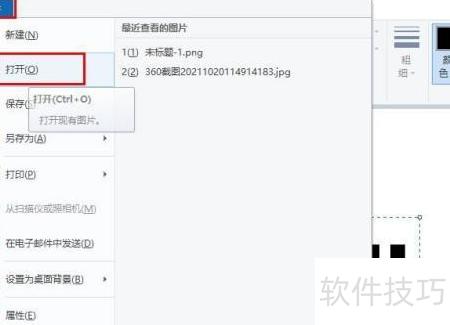 1、 打开画图工具,点击文件菜单中的打开,找到需要叠加到图片上的徽标文件。